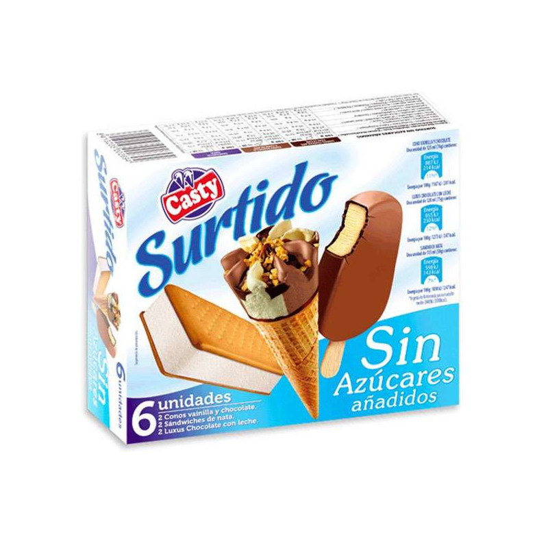 La caja contiene un surtido de 18 helados variados compuesto por 3 conos de vainilla-chocolate, 3 bombones de nata, 3 super-bombones de chocolate blanco, 3 super-bombones almendrados, 3 sándwiches de nata y 3 mini-sándwiches sabor bombón de stracciatella.
