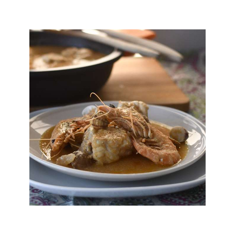 Bolsa de aproximadamente un kilo de frutos de mar preparados para añadir a la sopa. Contiene trozos de merluza, pinzas de buey, pedazos de langosta, langostino número 2, almeja marrón, cigala y langostino vannamei.